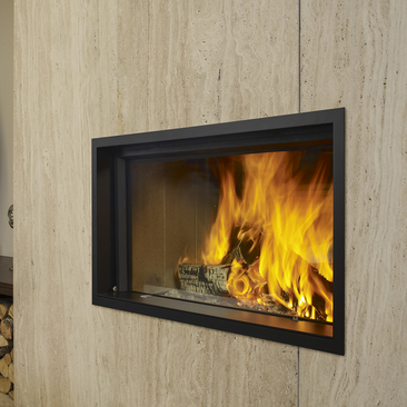 Camino a Legna Argento 900 DH M Design, bifacciale orizzontale con porta saliscendi e design curato con piena visione del fuoco grazie al sistema “vetro pulito”.