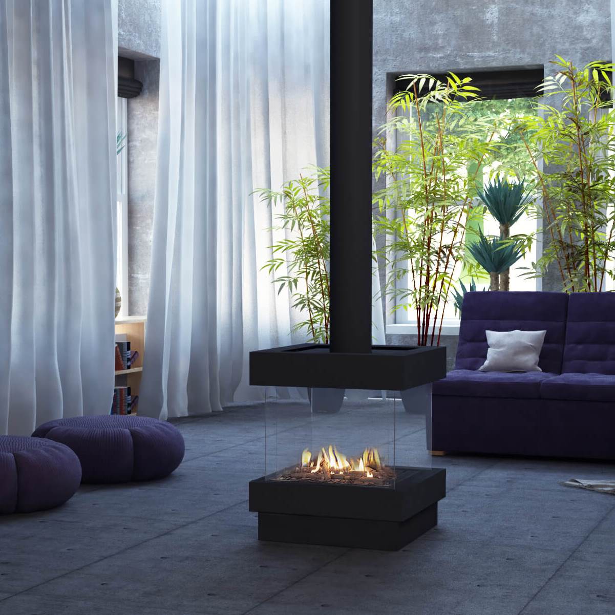 Il camino gas isola 70 è unico nel suo genere. Ideale per un centro stanza, permette la visione del fuoco a 360 gradi. Viene fornito da rivestire oppure con top e base metallica nera.