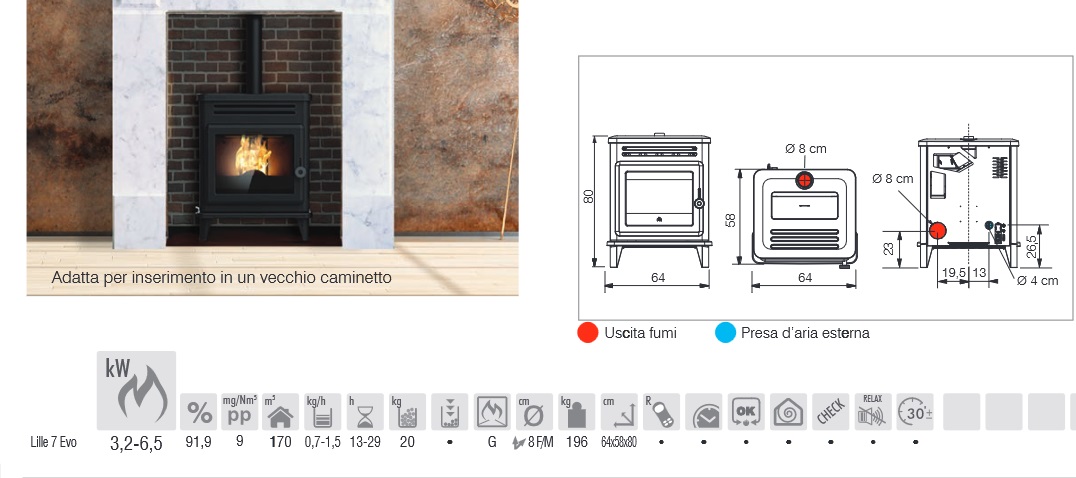 Stufa a Pellet Lille 7 Evo Edilkamin, con focolare in ghisa e uscita fumi superiore o posteriore.