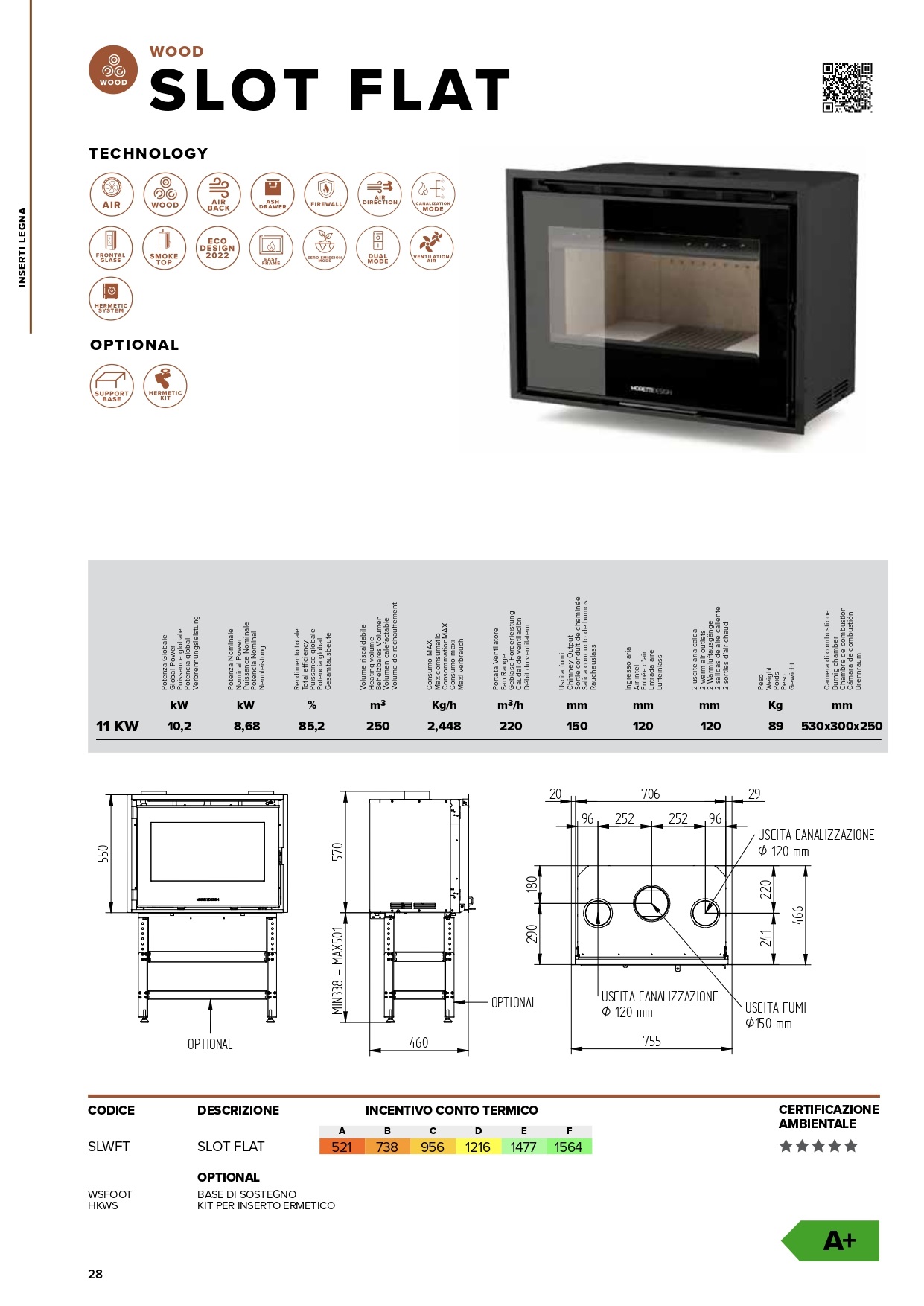 Inserto a Legna Slot Flat 11 kw Moretti Design, è dotato di una porta con il vetro trasparente per una migliore visione della fiamma, delle cornici estetiche racchiudono e caratterizzano il prodotto.